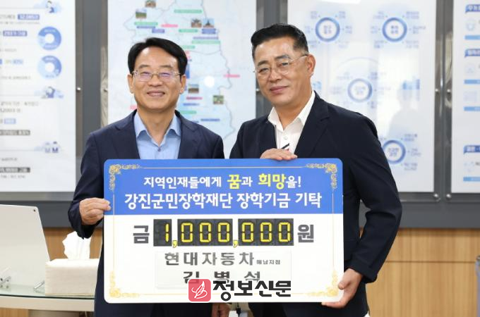 현대자동차 해남지점 김병석씨는 “재능 있는 학생들이 성장해 지역과 국가 경쟁력을 높이는 인재로 성장하길 바라는 마음에서 장학금을 기탁했다“며 ”강진군민장학재단의 인재 육성 사업에 함께할 수 있어 기쁘고 학생들이 꿈의 날개를 펼쳐 세계로 도약하는 인재로 성장하기를 바란다”고 소감을 밝혔다.