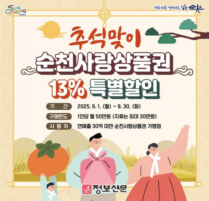 ![]() 순천시, 추석 맞이 순천사랑상품권 13% 할인판매 |
