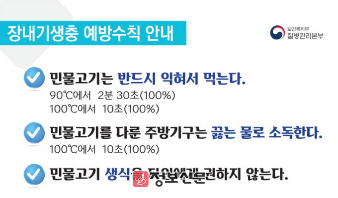 장내기생충 감염병을 예방하기 위해서는 ▲민물고기를 날것으로 먹지 않고 익혀서 먹기(90℃에서 2분 30초, 100℃에서 10초) ▲민물고기를 다룬 칼, 도마 등 조리 기구는 열탕 소독(100℃에서 10초) ▲민물고기 생식을 타인에게 권하지 않기 등의 예방 수칙을 지켜야 한다.