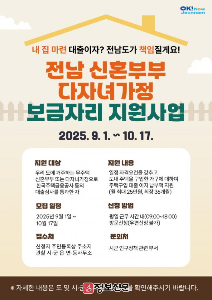 ![]() 전라남도, 2025년 신혼부부·다자녀가정 보금자리 지원사업 신규 대상자 모집 |