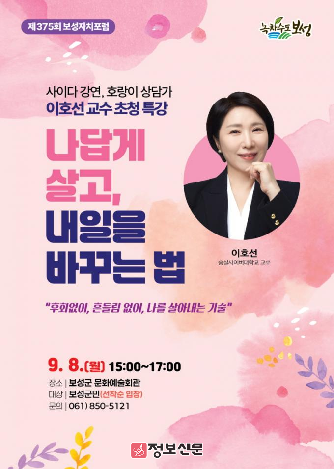 한편, 보성자치포럼은 1999년 시작해 올해로 26년째, 375회를 이어온 보성군 대표 인문 교양 프로그램으로, 다양한 분야 전문가를 초청해 군민과 함께 지혜를 나누고 미래를 모색하는 열린 배움의 장으로 자리매김하고 있다.