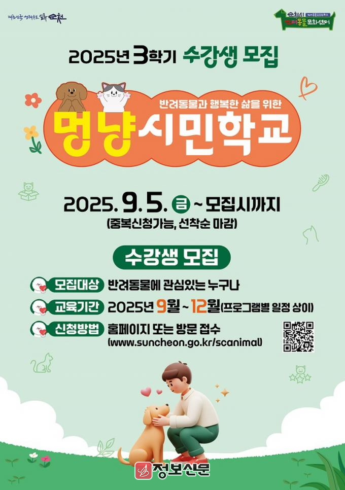 ![]() 순천시 반려동물문화센터, ‘멍냥시민학교’ 3학기 수강생 모집 |