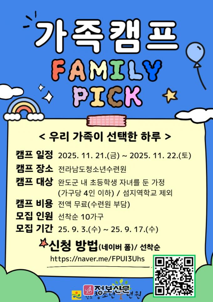 ![]() 전라남도청소년수련원, 가족캠프 패밀리픽(Family Pick) 참가자 모집 |