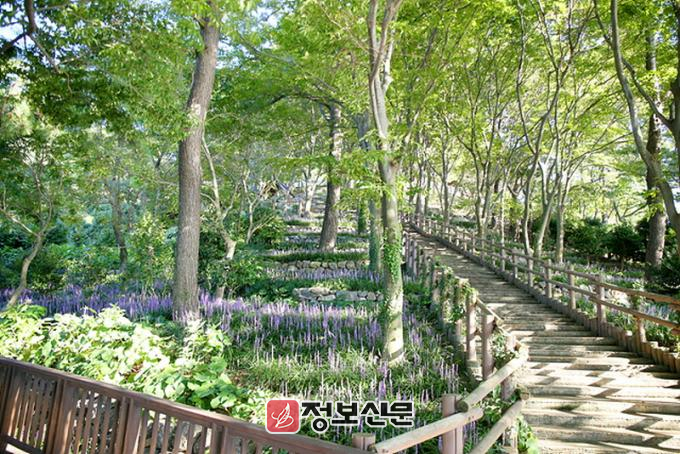 절벽의 단차를 따라 계단식으로 식재한 맥문동이 마치 보랏빛 폭포처럼 흐르며, 뒤이어 수국과 어우러져 그림 같은 풍경을 자아낸다.
