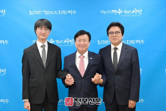 ![]() ▲ 여수시는 공개 모집을 통해 김경수(51) 씨를 여수시립국악단의 새로운 상임지휘자로 위촉했다.(왼쪽부터 임서현 단무장, 정기명 여수시장, 김경수 지휘자)