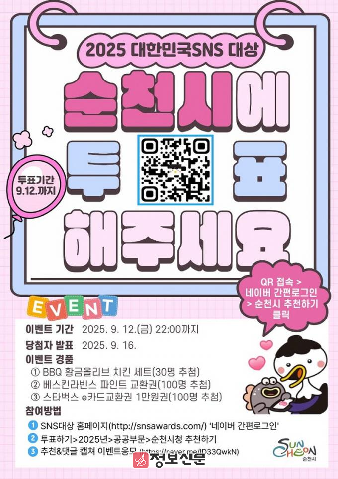 ![]() 순천시, 2025 대한민국 SNS 대상 순천시에 한 표를 |