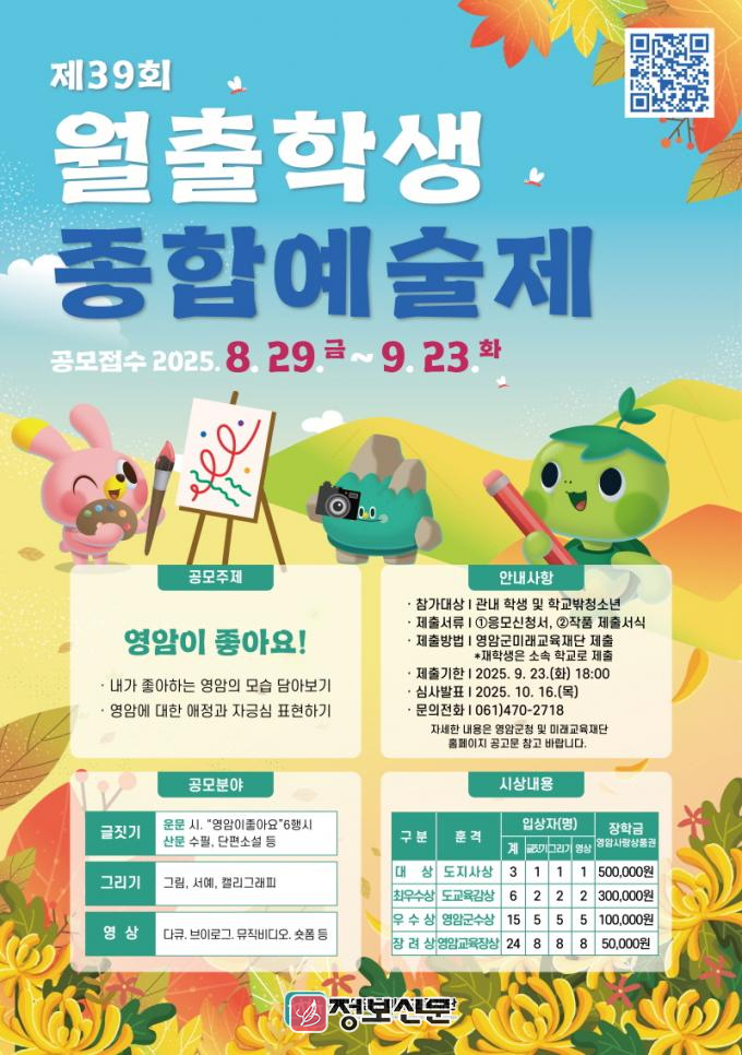 우승희 영암군미래교육재단 이사장은 “월출학생종합예술제를 영암 청소년들의 문화·예술 성취를 나누며 화합하는 장으로 만들겠다. 많은 청소년들의 작품 출품을 기대한다”고 말했다.