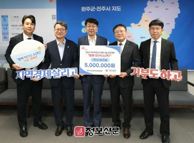 이날 ㈜신성건설 임직원들은 나눔 문화 확산을 위한 프로젝트에 적극 동참하겠다는 의지를 담아 모은 현금 500만 원을 전주시에 전달했다.