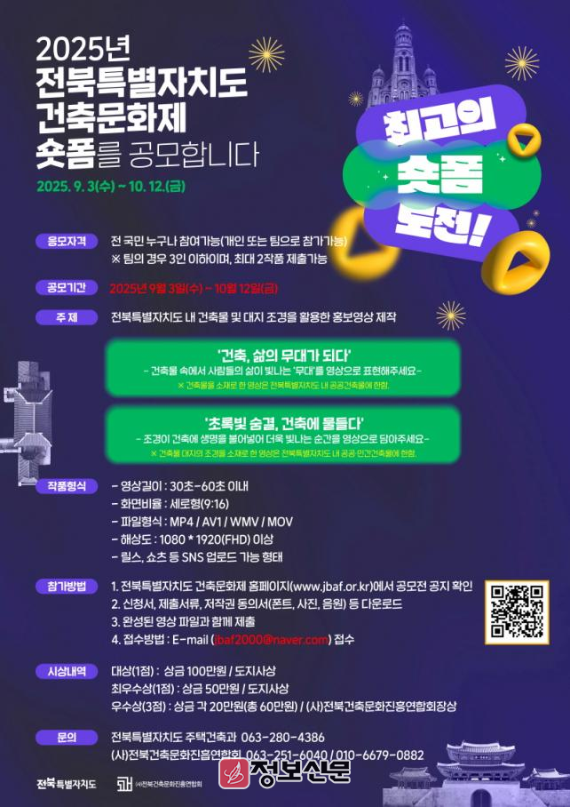 ![]() 전북특별자치도, 제26회 건축문화제 전북의 ‘美’를 숏폼 영상 공모전 개최 |
