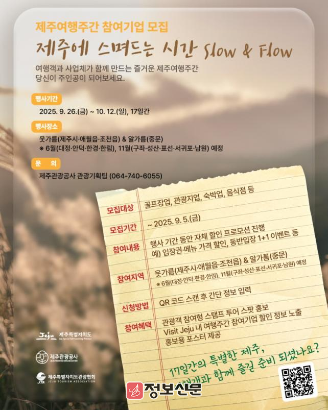 ![]() 제주관광공사, 가을 제주여행주간 참여기업 모집 |