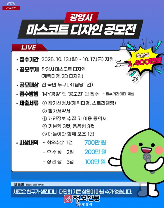 심사는 시민 선호도 조사 50%와 전문가 심사 50%를 합산해 진행된다. 총상금은 1,400만 원으로, 최우수상 700만 원(1점), 우수상 각 200만 원(2점), 장려상 각 100만 원(3점)이 수여된다. 결과는 11월 25일 ‘MY광양’ 앱과 광양시 누리집에 공지되며, 개별 통보도 이뤄진다. 선정된 작품은 향후 광양시 공식 마스코트 운영에 활용될 예정이다.