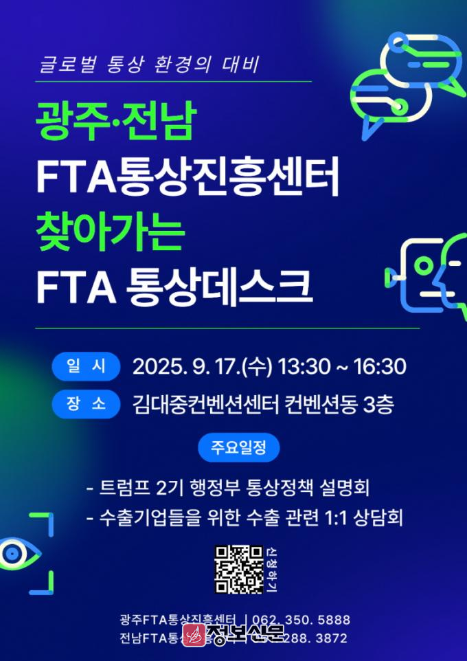 자세한 사항과 참석 신청은 전남FTA통상진흥센터 홈페이지(http://fta.jepa.kr) 또는 행사 포스터의 QR코드를 통해 확인할 수 있다.