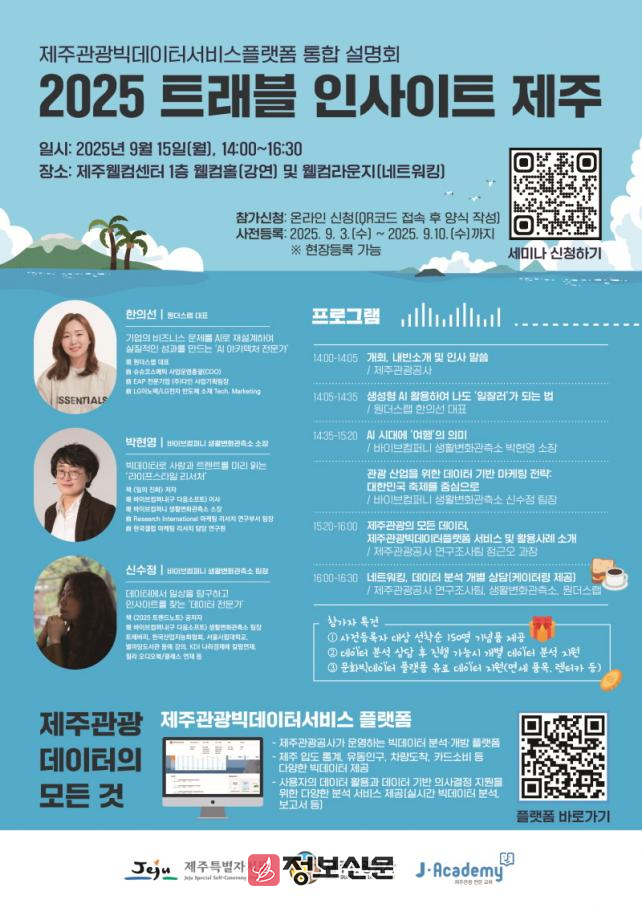 세미나의 사전 신청을 비롯한 자세한 내용은 제주관광빅데이터서비스플랫폼 홈페이지(data.ijto.or.kr) 내 공지사항에서 확인할 수 있다.