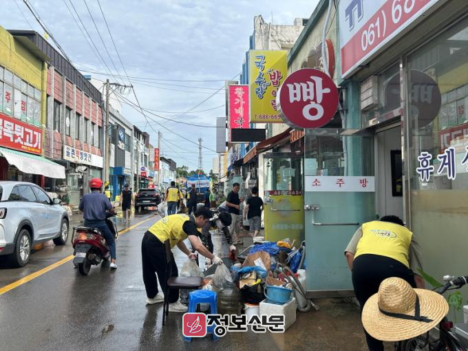 ![]() ▲ 시는 8일 율촌면 조화리 일원 상가 복구 작업에 인력 60여 명과 노면 살수차를 투입하고 압롤박스를 현장에 배치해 오염된 도로 세척과 폐기물 처리를 신속히 마쳤다.