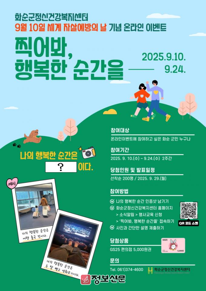 참여자는 ‘나의 행복한 순간’을 담은 인증 사진과 간단한 설명을 화순군정신건강복지센터 홈페이지(소식 알림>행사·교육 신청) 게시판에 9월 24일까지 게시하면 된다. 참여자 중 선착순 200명에게는 편의점 모바일 상품권이 제공될 예정이다.
