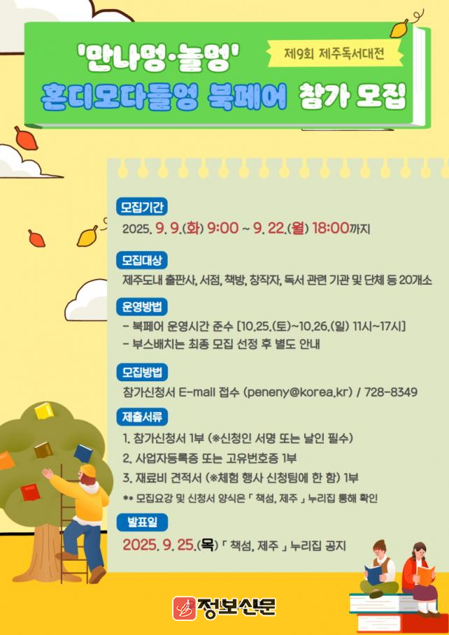 모집 기간은 9월 9일(화)부터 9월 22일(월) 오후 6시까지이며, 총 20개 팀을 선발한다. 최종 선정 결과는 오는 9월 25일(목) ‘책섬, 제주’ 누리집을 통해 발표될 예정이다.