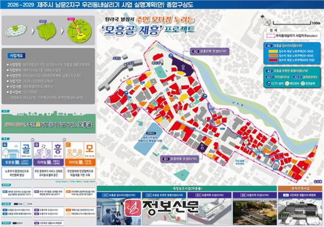 남문2지구 우리동네살리기 사업은 이도1동 일원(69,630㎡)을 대상으로 ‘탐라국 발상지, 주민 모다정 누리는 모흥골 재흥’을 목표로 2026년부터 4년간 총 93억 원(국비 50억 원, 지방비 43억 원)이 투입된다.