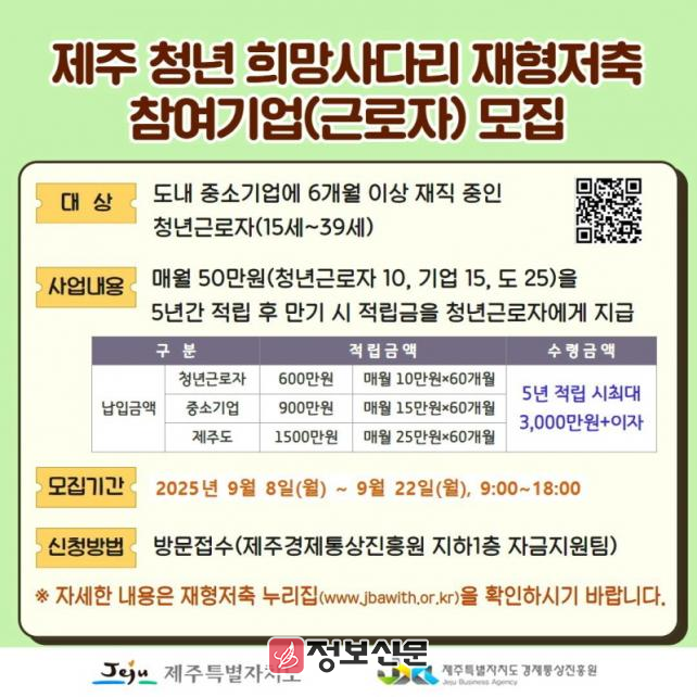 ![]() 제주경제통상진흥원, 제주 청년 희망사다리 재형저축 참여자 추가 모집 |