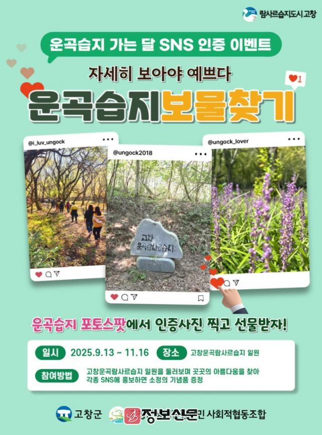 ![]() 고창군, 운곡람사르습지 SNS인증이벤트 ‘운곡습지 보물찾기’ 운영 |