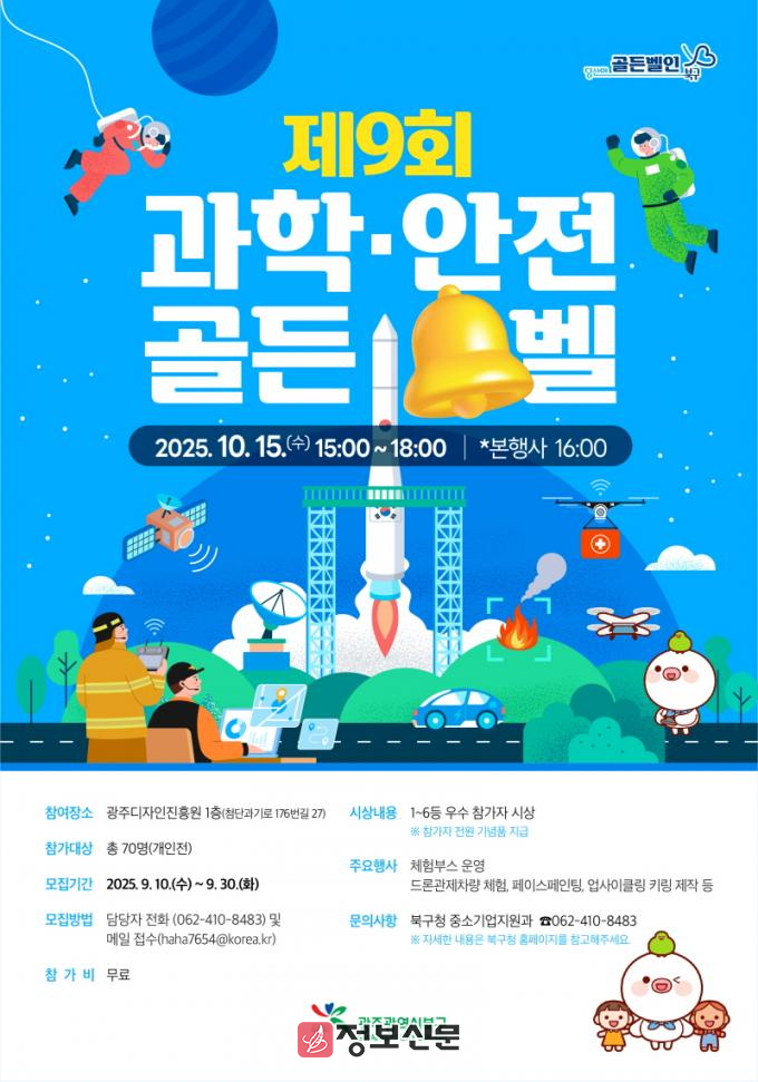 참가자에게는 초등학교 교과과정 수준의 과학 및 안전 상식으로 구성된 문제가 OX형, 4지선다형, 단답형 등의 형식으로 출제되고 성적 상위 6명에게는 북구청장 표창과 소정의 상금이 수여될 계획이다. 아울러 행사 당일에는 ▲드론 관제 차량 체험 ▲심폐소생술 실습 ▲업사이클링 키링 제작 ▲페이스페인팅 등 다양한 분야의 체험 부스가 함께 운영돼 행사에 다채로움을 더할 예정이다.