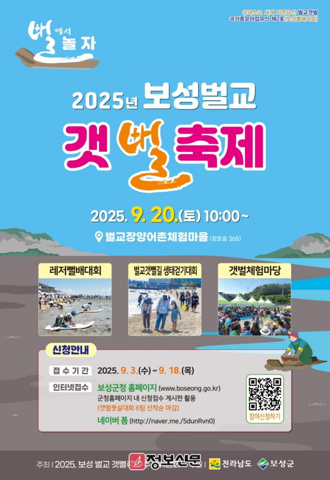 이번 축제는 ‘뻘에서 놀자!’라는 주제로, 보성벌교갯뻘축제 추진위원회(위원장 김길두)가 주최·주관하며, 유네스코 세계자연유산으로 등재된 보성벌교갯벌과 국가중요어업유산 제2호 보성뻘배어업의 가치를 널리 알리는 가족 친화형 생태 문화 축제로 추진된다.