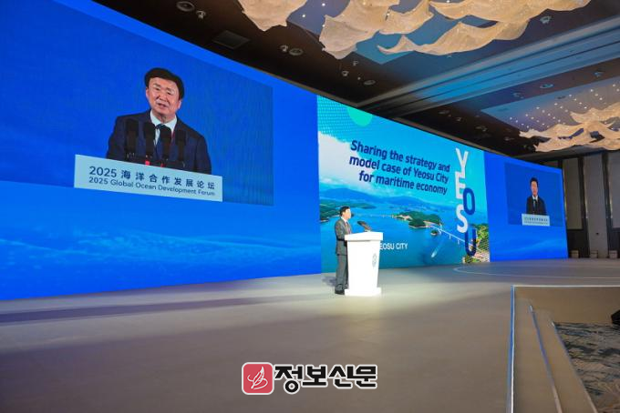 ![]() ▲ 정기명 여수시장이 지난 8일 중국 칭다오에서 열린 ‘2025년 산둥성 국제해양발전포럼’에 초청받아 주제 발표자로 나서 2026여수세계섬박람회를 소개하고 국제적 관심을 이끌어냈다. |