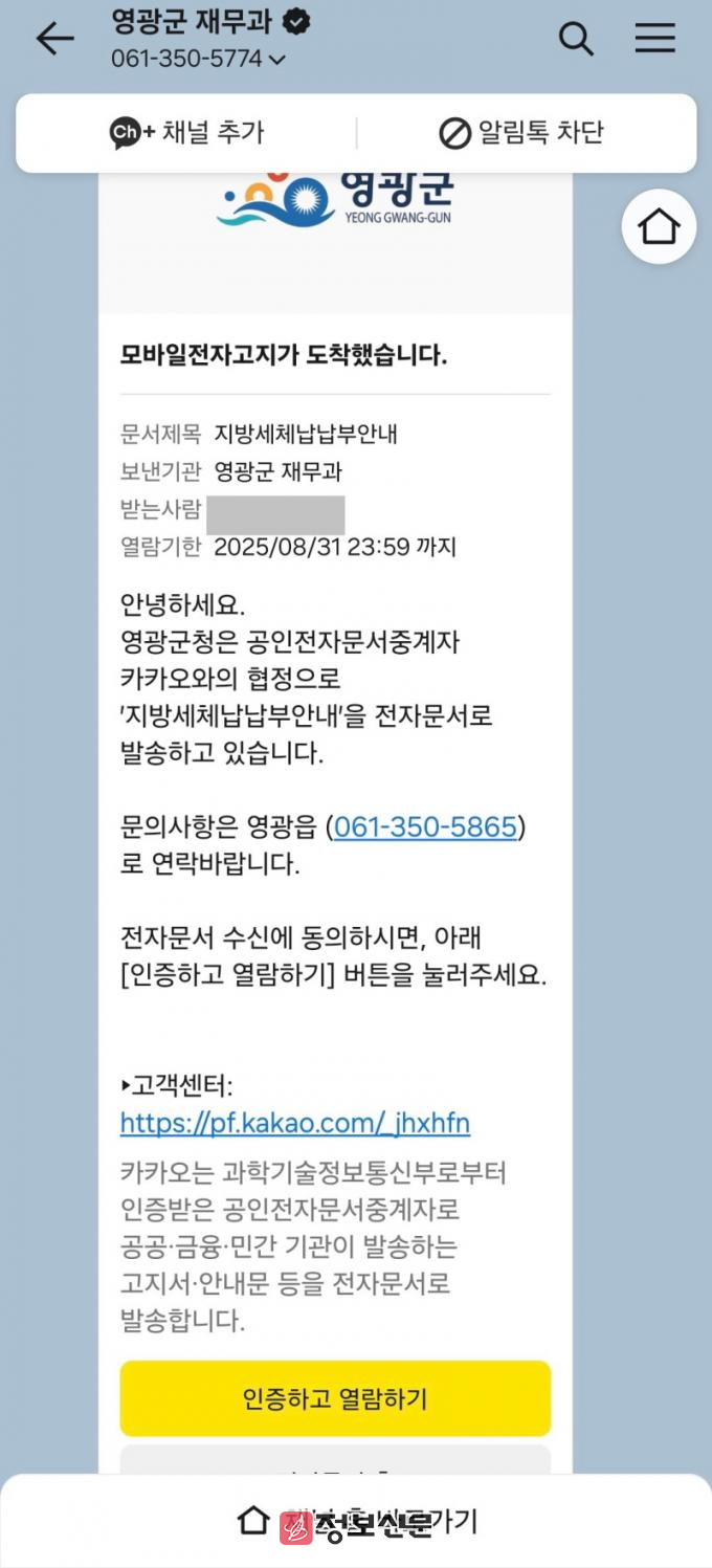 ![]() 영광군, 체납지방세 카톡 전송으로 징수 효과 ‘톡톡’ |