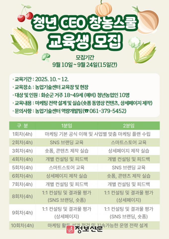 ![]() 화순군, ‘청년CEO 창농스쿨’ 교육생 모집 |