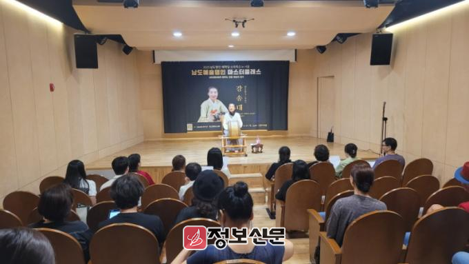 이번 남도명인예학당은 ▲서화(문인화, 한국화) ▲소리(강강술래, 남도잡가, 닻배노래, 엿타령) ▲북놀이 ▲씻김굿(장단, 소리) 등 전통예술의 핵심 분야를 아우르는 명인들이 진행하는 교육이며, 실기 중심의 심화 교육으로 구성됐다.