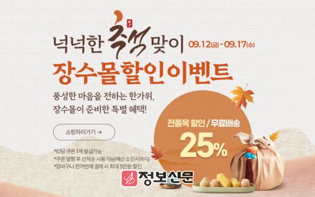 이번 이벤트는 장수몰 회원을 대상으로 진행되며 전 품목 구매 시 사용할 수 있는 25% 할인 쿠폰이 제공된다.