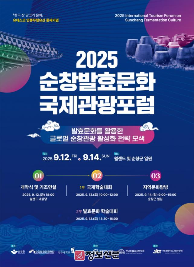 행사는 총 3일간 진행되며, ▲9월 12일에는 쉴랜드 대강당에서 개막식 및 기조강연이 진행되고, ▲13일에는‘발효문화·인류문화유산·관광’을 주제로 한 국제학술대회, ▲14일에는 강천산 일원을 중심으로 한 순창 문화체험 프로그램이 운영된다.