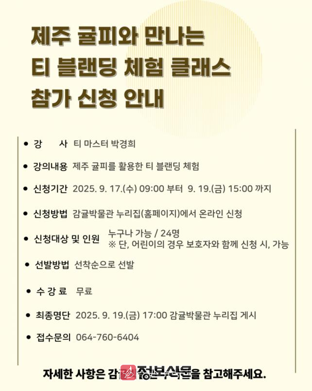 전익현 서귀포시 관광지관리소장은 “이번 가을 강좌를 통해 제주 감귤의 문화적 가치를 재발견하고, 차와 명상을 통한 심리적 회복의 시간을 시민과 관광객 모두에게 제공하길 기대한다”고 전했다.