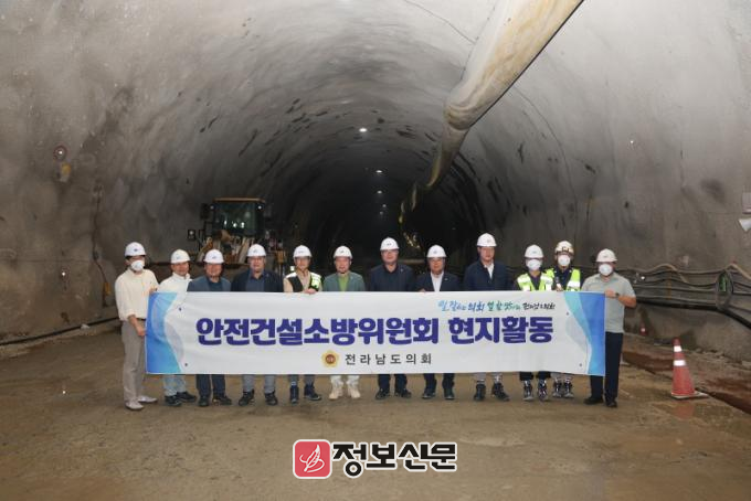 ![]() 전라남도의회 안전건설소방위원회 위원들이 호남고속철도(2단계)4공구 무안터널 건설 현장을 방문해 추진현황을 보고받고 기념사진을 찍고 있다.