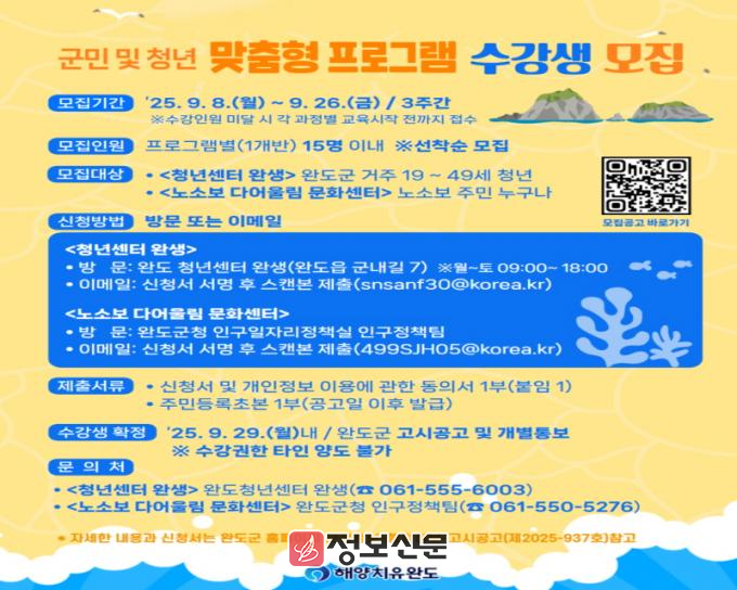 ![]() 완도군, 군민.청년 맞춤형 프로그램 신청접수 |