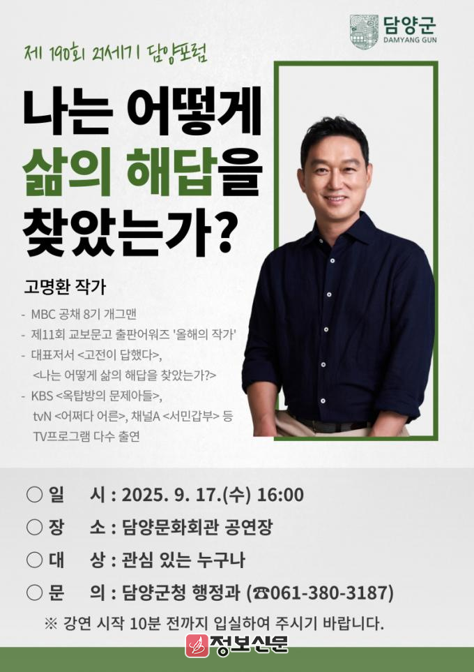 담양군 관계자는 “삶의 방향에 대해 함께 고민해 볼 수 있는 자리를 마련했다”며 “이번 강연이 군민들에게 따뜻한 울림을 전하길 기대한다”고 말했다.