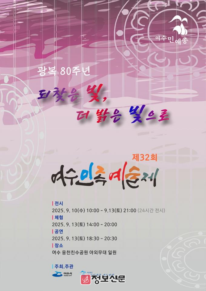 김칠선 여수지회장은 “진보적 예술정신을 바탕으로 지역 문화분권과 문화민주주의 발전을 위해 노력해 온 32년의 전통이 이번 축제를 통해 더욱 빛을 발하길 바란다”며 “특히 광복 80주년을 맞아 ‘되찾은 빛, 더 밝은 빛으로’라는 주제로 열리는 이번 예술제가 시민 모두에게 의미 있는 시간이 되기를 기대한다”고 말했다.