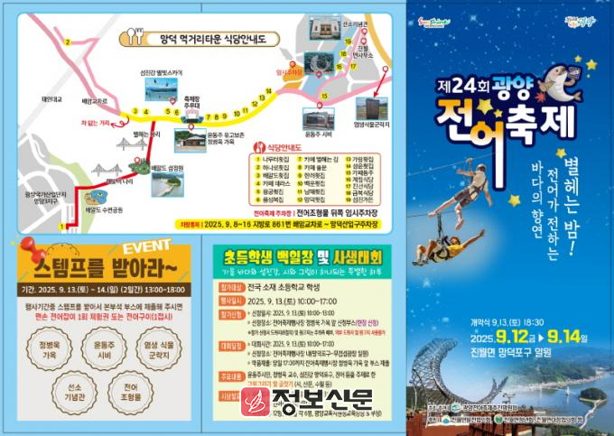 한편, 대한민국 가을 축제의 대명사인 제24회 광양전어축제는 진월 전어잡이소리 시연, 맨손전어잡기 및 전어구이체험 등 축제의 정체성을 살린 프로그램이 풍성하다. 특히, 올해는 개최 이래 처음으로 해상에서 직접 전어를 잡는‘해상 전어잡이 시연’이 13일과 14일, 17시부터 각각 진행돼 관광객에게 특별한 볼거리를 제공한다.