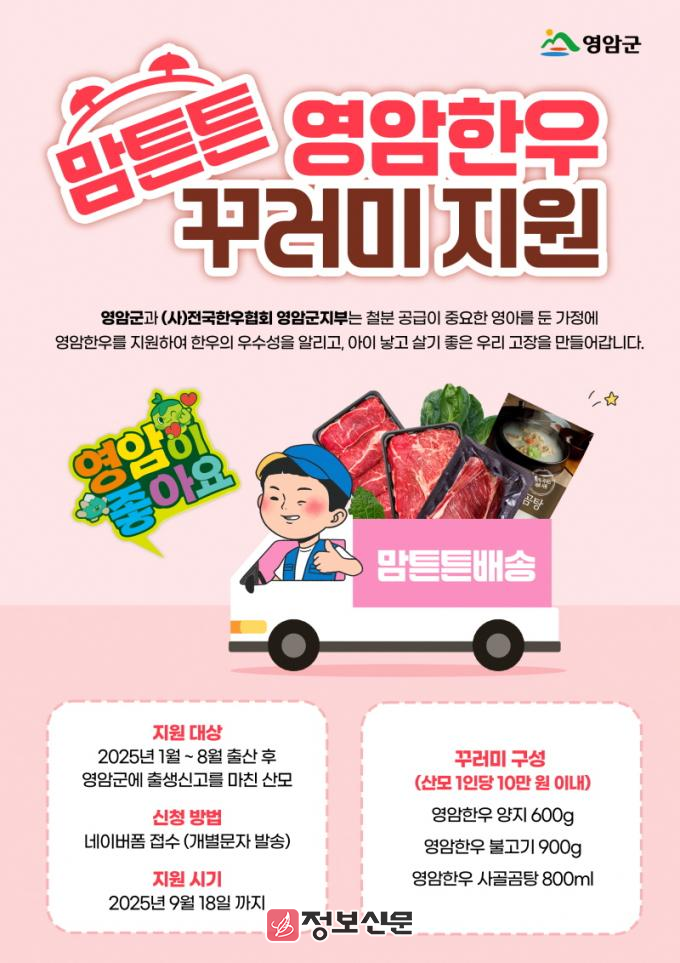이 지원사업은 지역 소멸 위기 극복과 출산 장려를 위한 것으로, 올해 1~8월 출산한 영암 산모 120명에게 1인당 10만원 상당의 영암한우 꾸러미를 제공하는 내용이다.