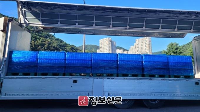 광주시는 상수도사업본부 용연정수장에서 생산한 빛여울수를 상무대 51군수지원단 14t 트럭 1대, 5t 트럭 2대에 실어 강릉시에 전달했다.