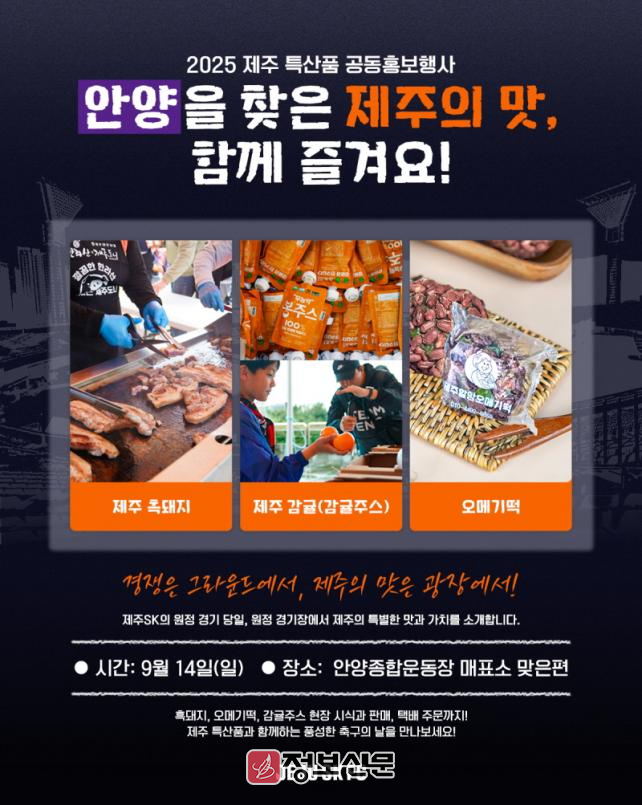 제주SK는 9월 14일(일) 오후 7시 안양종합경기장에서 열리는 FC안양과의 하나은행 K리그1 2025 29라운드 원정경기를 앞두고 '제주 알리기' 행사를 진행한다. 원정팀이 상대팀 홈 경기장에서 홈 관중 대상 원정팀 관련 행사를 진행하는 것은 K리그 최초다. 현재 안양과 치열한 순위 경쟁을 펼치고 있지만 K리그 구성원으로서 공동 마케팅 및 상생의 가치를 실현하고자 손을 맞잡았다. 제주특별자치도(도지사 오영훈)는 도차원에서 선도적인 노력과 지원을 아끼지 않는다.