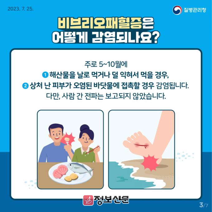 비브리오패혈증(비브리오 불니피쿠스 세균 감염)은 주로 5월부터 10월 사이에 발생한다. 균에 오염된 해산물을 날로 먹거나 덜 익혀 먹을 경우, 피부에 난 상처가 오염된 바닷물에 접촉할 경우 감염된다.