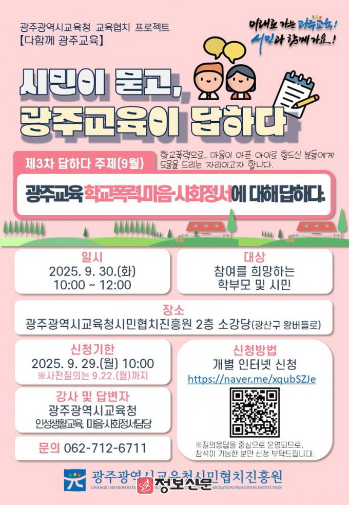 한편 시민협치진흥원은 오는 10월 29일에는 ‘국제교육, 글로벌 리더 세계 한바퀴’을 주제로 제4차 ‘시민이 묻고, 광주교육이 답하다’ 행사를 진행한다.