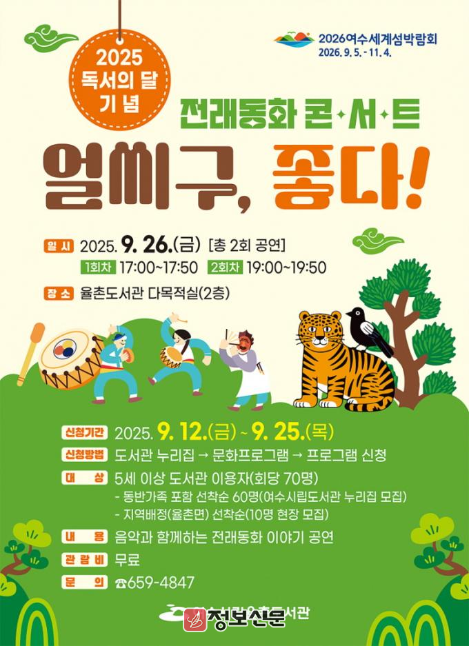 ![]() 여수시, 율촌도서관서 전래동화 콘서트 ‘얼씨구, 좋다!’ 운영 |