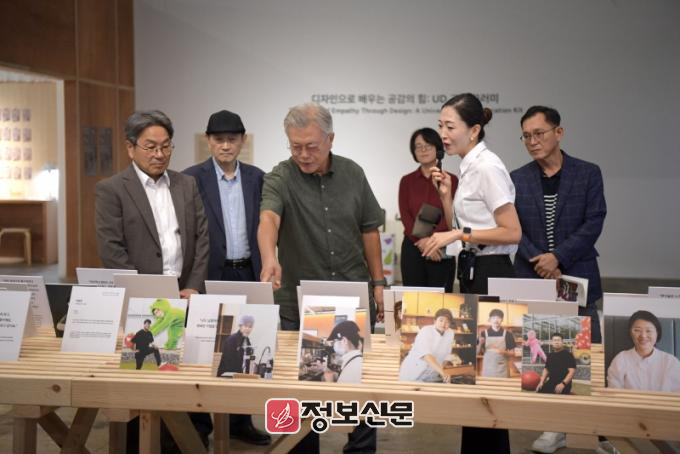 문 전 대통령 부부와 강 시장은 약 1시간 동안 ▲포용디자인 35년의 여정-옥소와 스마트디자인 ▲광주디자인진흥원의 광주도시철도 포용디자인 프로젝트 ▲공간경험 확장을 위한 이(e)-모빌리티 모듈형 가전 ▲로봇 보조 엄지손가락 ‘세 번째 엄지(Third Thumb)’ ▲고령자 돌봄 로봇 ‘래미(Rami)’ 등 전시를 꼼꼼히 살펴봤다.