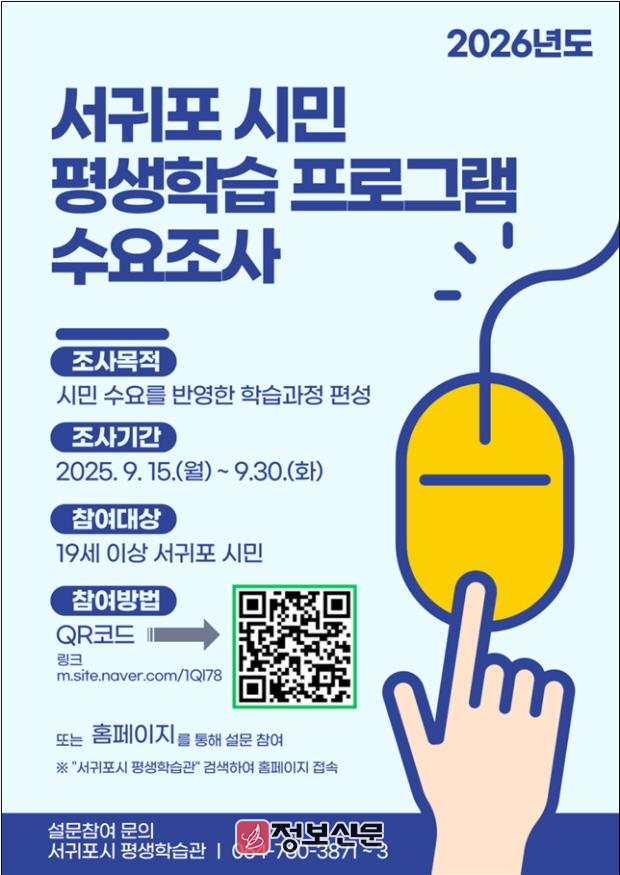 ![]() 서귀포시, 2026년 시민 평생학습 온라인 수요조사 실시 |