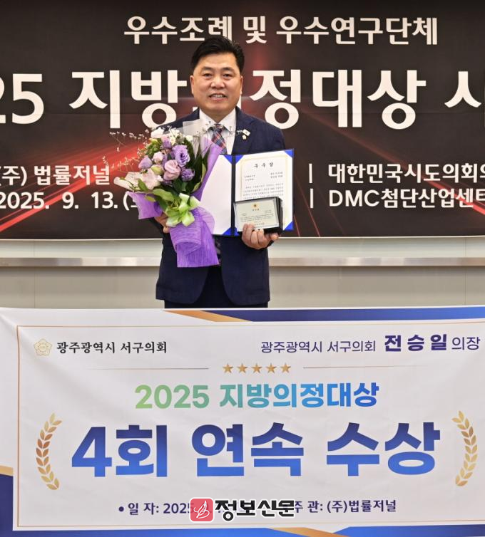 ![]() 서구의회 전승일 의장, 법률저널 2025 지방의정대상 4회 연속 수상 쾌거 (사진=전승일 의원실 제공) |