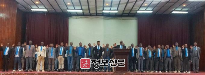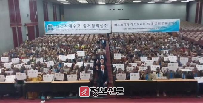 ![]() [사진제공=신천지예수교회] 지난 10일 ‘신천지예수교 증거장막성전 베드로지파 에티오피아 84개 교회 간판 교체식’에서 84개 교회 대표 목회자들이 결의식을 진행하고 있다. |
