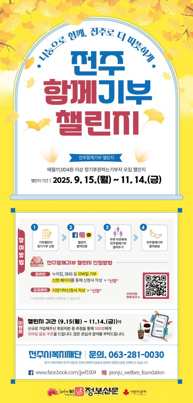 ‘전주함께기부 챌린지’는 전주시민이 함께 어려움에 처한 이웃의 위기 극복을 돕고 다시 일어설 수 있도록 지원하기 위한 것으로, 매월 1만1004원 이상 정기기부를 약정하는 기부천사를 발굴하는 캠페인이다.