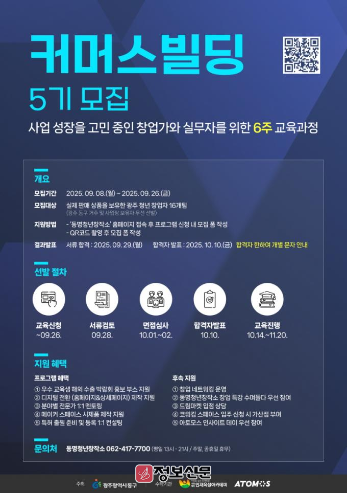 ‘커머스빌딩’은 동구가 운영하는 청년 창업 지원 공간인 동명청년창작소의 대표 프로그램이다. 커머스빌딩 5기 프로그램은 10월 14일부터 6주간 오프라인 교육으로 운영되며, 실전 중심의 커리큘럼과 사후 지원을 통해 지역 청년 창업가들이 사업 역량을 강화할 수 있도록 도울 예정이다.