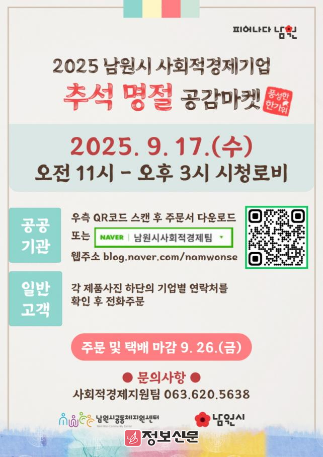 ![]() 남원시, 추석 명절 사회적경제공감마켓 개최 |